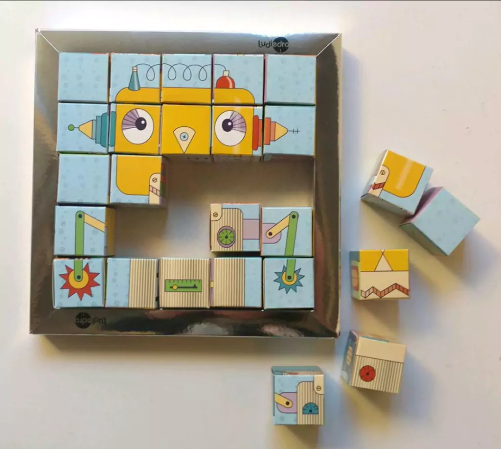 Original rompecabezas de 25 cubos para armar 6 robots y también combinarlos armando tantos robots como la imaginación lo permita.