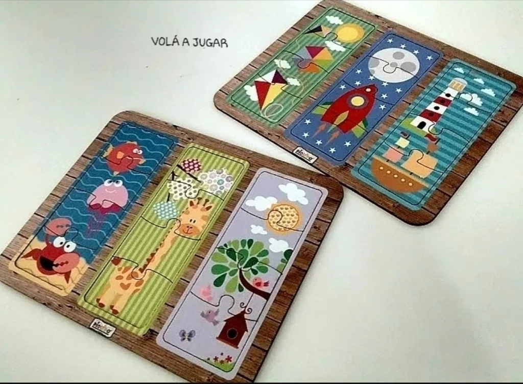 Incluye 3 rompecabezas de 4 piezas cada uno.