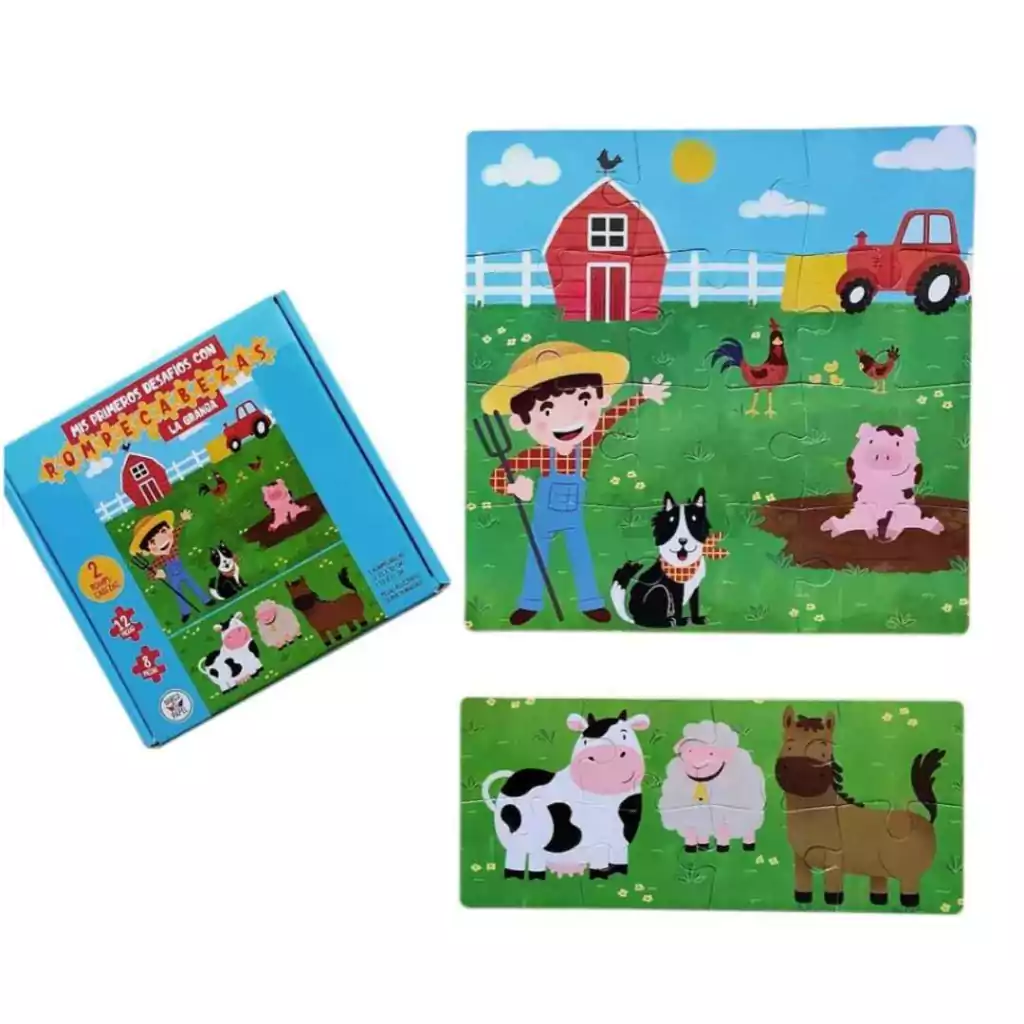 Dos rompecabezas de 8 y 12 piezas con animales de la granja, con piezas grandes super resistentes. Ideal para que los mas pequeños puedan comenzar a armar los primeros rompecabezas.